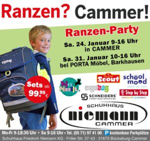 Im Januar bieten wir zwei Termine rund um das Thema Schulranzen an. Eltern können verschiedene Marken direkt vergleichen und sich umfassend beraten lassen. Passform, Gewicht, Sicherheit und Ausstattung werden individuell erklärt. Termine:Sa., 24. Januar · 9–16 Uhr · in CammerSa., 31. Januar · 10–16 Uhr · bei PORTA Möbel, Barkhausen Vor Ort verfügbar sind unter
